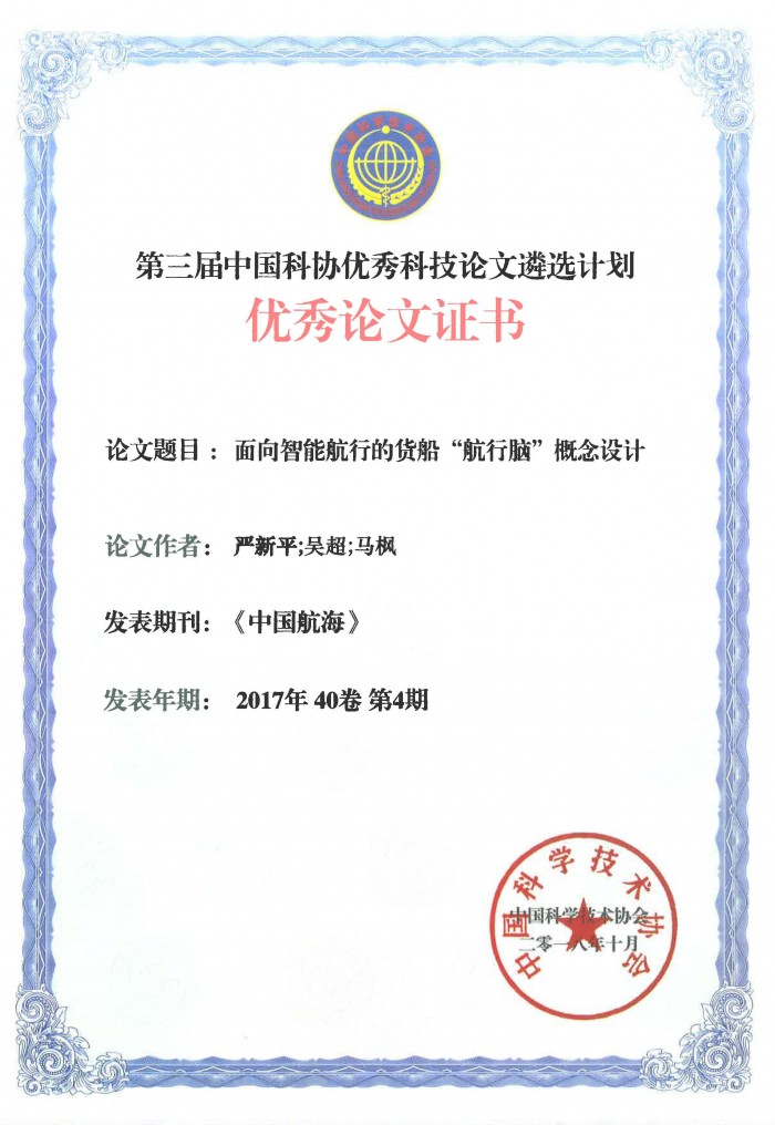 由武汉理工大学严新平、吴超、马枫撰写的论文《面向智能航行的货船“航行脑”概念设计》在第三届中国科协优秀科技论文遴选计划评选中获得优秀奖。据悉,中国科协从全国的科技论文中每年仅评选出不超过100篇论文授予优秀论文称号,评选采用背靠背完全封闭的评选模式,今年是第三届,共评选出优秀科技论文95篇。该论文是由中国航海学会主办的《中国航海》杂志社推荐的,刊登在《中国航海》2017年第四期,这是航海类论文首次在中国科协全国优秀科技论文评选中获此殊荣。