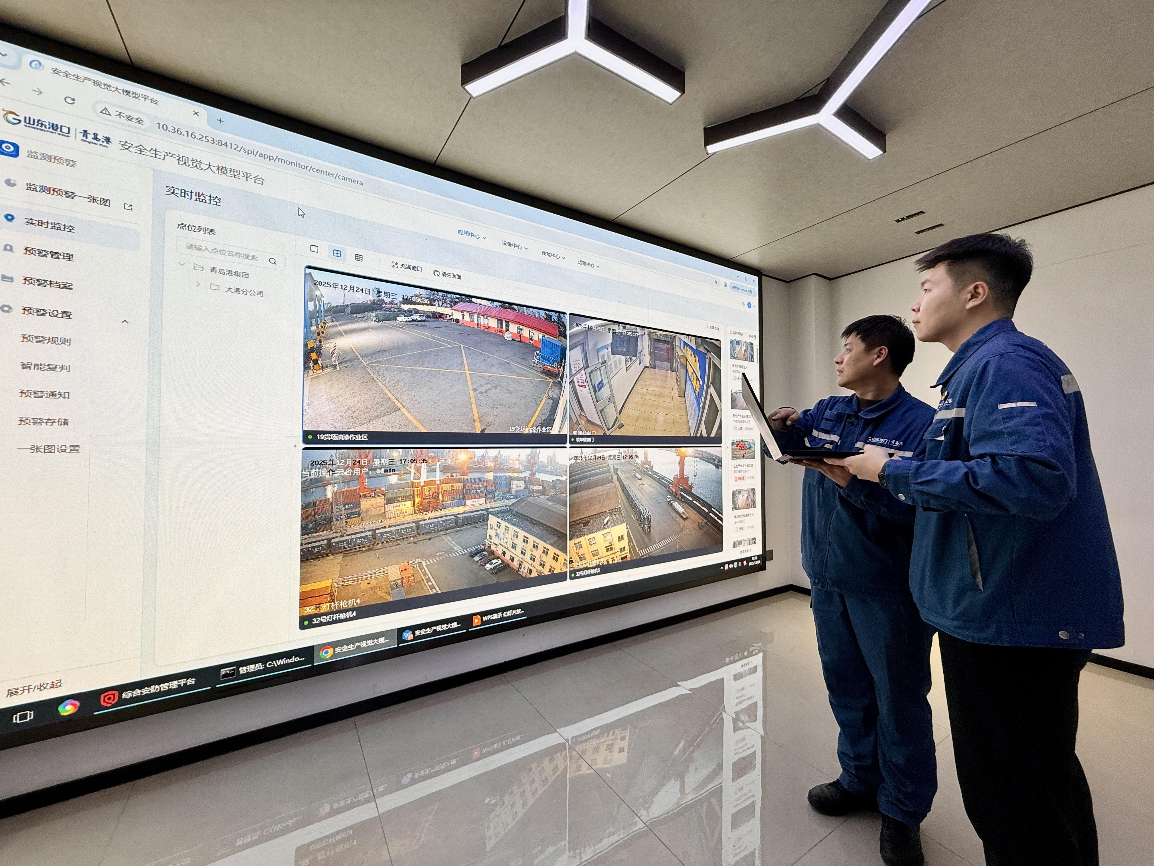 随着港口作业场景日益复杂,传统“现场巡检+视频监控”模式逐渐暴露出覆盖有限、查纠效率不足等问题。作为中试基地的创新成果之一,青岛港以大港港区为试点,率先落地安全生产视觉大模型,形成了一套高效运转的智能化安全查纠系统,为港口安全生产注入科技动能。