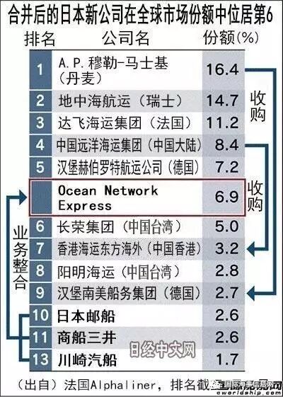 日本3家大型海运企业日本邮船、商船三井、川崎汽船7月10日就合并集装箱船业务后成立的新公司正式起步一事在东京召开记者会。新公司名为“Ocean Network Express”(ONE),运输能力约占全球市场7%份额,位居第6。另一方面,中国大型国企中国远洋9日决定收购香港海运企业东方海外(OOCL),日本企业与全球海运巨头的差距依旧没有缩小。